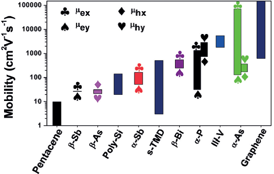 2015年,以块体灰砷与灰锑为母体材料,南京理工大学曾海波团队设计了二维砷烯与锑烯热动力学最稳定的原子结构,并预测了其半导体性电子结构(Angew. Chem. In. Ed. 2015, 54, 3112)。但是除了维度缩减诱导的半金属-半导体转变以外,它们的价带顶、导带底、迁移率等对将来的器件设计非常关键。最近,该团队系统地探索了第五主族单原子二维材料的以上关键特征,包括磷烯、砷烯、锑烯、铋烯等(Angew. Chem. Int. Ed. 2016, 55, 1666)。结果表明它们的带隙能量涵盖0.36至2.62 eV,对应于从红外到可见的宽光谱响应。价带顶分布于-4.66到-3.05 eV之间,导带底分布于-3.08到-1.22 eV之间。令人兴奋的是,结果表明它们会具有较高的迁移率,尤其是α相砷烯,高达105 cm2V-1s-1,与石墨烯相当,高于目前电子器件经典材料硅,也高于经典光电子材料三五族半导体。低维材料在线长期提供这一类优秀的高性能材料,这些结果为第五主族单原子二维材料的电子与光电子器件设计提供了关键参数。